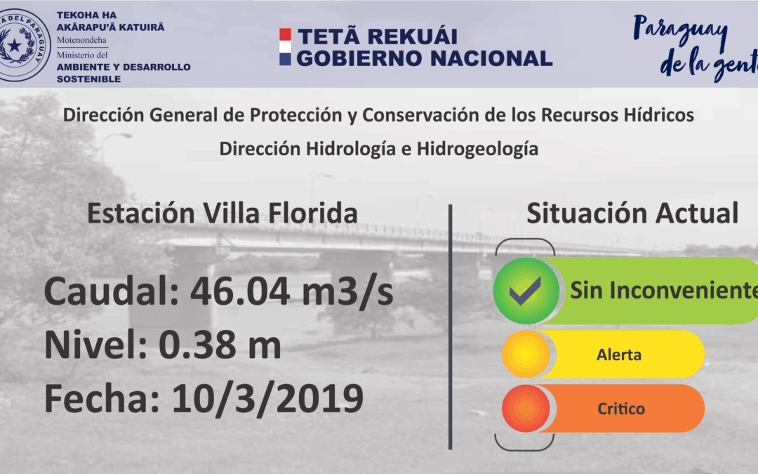 El Ministerio del Ambiente y Desarrollo Sostenible(MADES), a través de la Dirección General de Protección y Conservación de los Recursos Hídricos (DGPCRH) en base a la Resolución N° 511/16 Por la cual se regula la extracción de agua por bombeo para el regadío de cultivo de arroz en la Cuenca del Río Tebicuary, comunica a todos los productores de la Cuenca Baja del Rio Tebicuary que en fecha 10 de marzo de 2019 se ha registrado caudales mayores a 40 m3/s superando así el nivel de bombeo escalonado o sin inconvenientes.