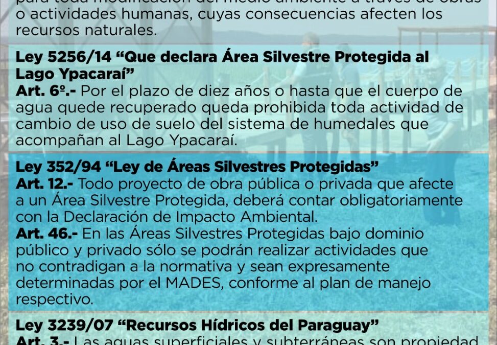 Ante la situación crítica que atraviesa el Lago Ypacaraí y luego de la intervención realizada por fiscalizadores del Ministerio del Ambiente a la construcción de un muelle a orillas y sobre el cauce del Ypacaraí, la autoridad ambiental recuerda a la ciudadanía que el Lago y sus adyacencias forman parte de un Área Silvestre Protegida, declarada por Ley y cuenta con un Plan de Manejo que debe ser tenido en cuenta por los propietarios asentados en su zona de influencia. Además, para realizar cualquier tipo de obras debe tener obligatoriamente la Declaración de Impacto Ambiental, expedida por la autoridad ambiental.
