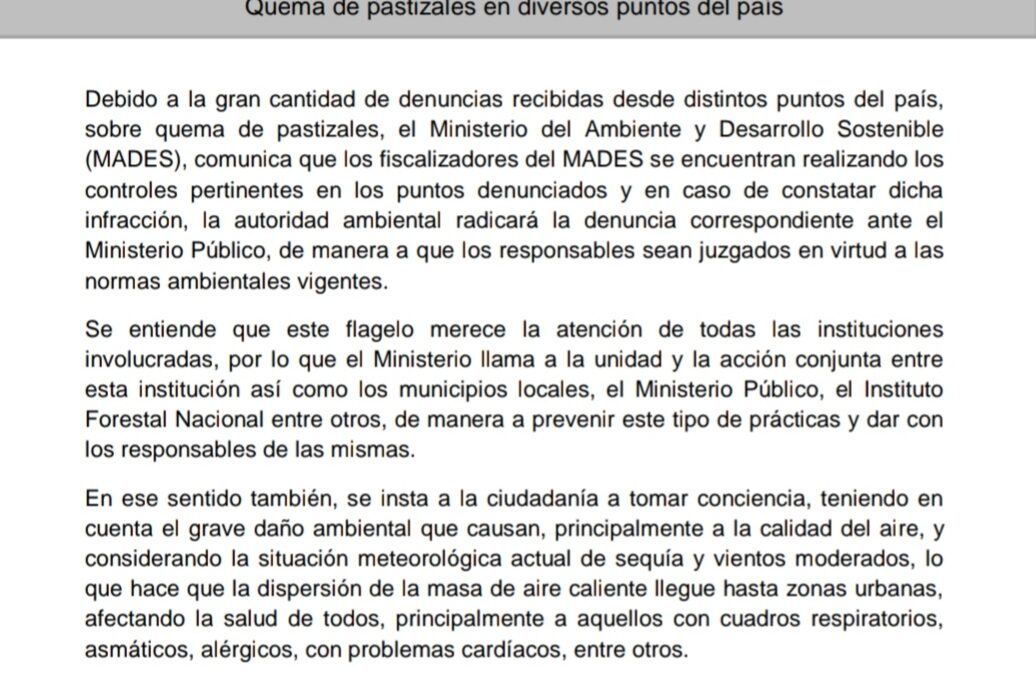Debido a la gran cantidad de denuncias recibidas desde distintos puntos del país, sobre quema de pastizales, el Ministerio del Ambiente y Desarrollo Sostenible (MADES), comunica que los fiscalizadores del MADES se encuentran realizando los controles pertinentes en los puntos denunciados y en caso de constatar dicha infracción, la autoridad ambiental radicará la denuncia correspondiente ante el Ministerio Público, de manera a que los responsables sean juzgados en virtud a las normas ambientales vigentes.