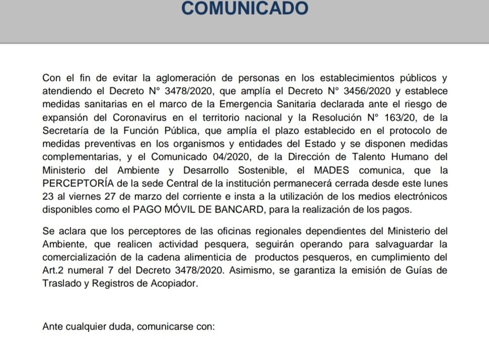 Con el fin de evitar la aglomeración de personas en los establecimientos públicos y atendiendo el Decreto N° 3478/2020, que amplía el Decreto N° 3456/2020 y establece medidas sanitarias en el marco de la Emergencia Sanitaria declarada ante el riesgo de expansión del Coronavirus en el territorio nacional y la Resolución N° 163/20, de la Secretaría de la Función Pública, que amplía el plazo establecido en el protocolo de medidas preventivas en los organismos y entidades del Estado y se disponen medidas complementarias, y el Comunicado 04/2020, de la Dirección de Talento Humano del Ministerio del Ambiente y Desarrollo Sostenible, el MADES comunica, que la PERCEPTORÍA de la sede Central de la institución permanecerá cerrada desde este lunes 23 al viernes 27 de marzo del corriente e insta a la utilización de los medios electrónicos disponibles como el PAGO MÓVIL DE BANCARD, para la realización de los pagos.