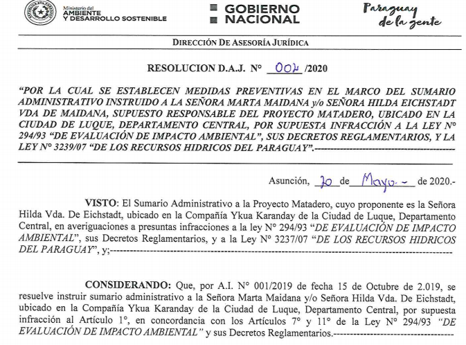 La Dirección de Asesoría Jurídica del MADES, dependencia encargada de llevar adelante la investigación, había solicitado informes técnicos a las diferentes direcciones del Ministerio y tras analizarlos, concluyeron que “la actividad en cuestión estaría llevándose a cabo sin reunir los requisitos ambientales exigidos para el efecto, correspondiendo la adopción de medidas al respecto”, por lo que se dispuso la inmediata suspensión preventiva de actividades en el marco del sumario administrativo, tendiente a evitar eventuales daños ambientales, hasta tanto los responsables se adecuen a las normativas ambientales.