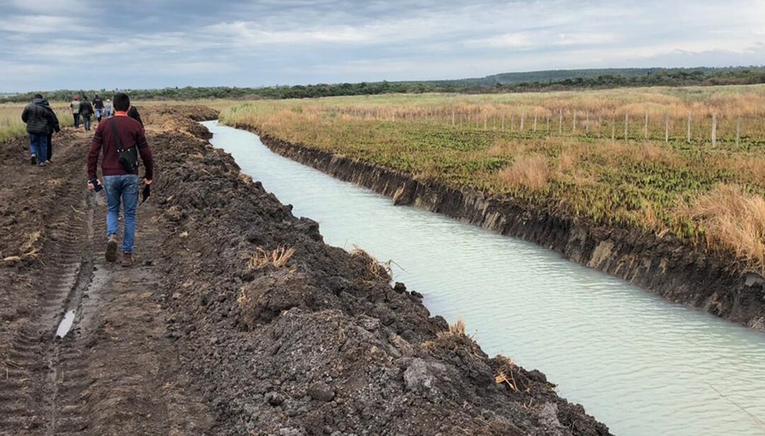 Según el informe de los técnicos, el camino construido, que va desde la vivienda hasta el río Monday, tiene una longitud de unos 4 km. Asimismo, se observó la excavación de dos canaletas, una al margen derecho y otra al margen izquierdo de la propiedad. Estos valos o canales, se profundizan y aumentan su profundidad a medida que se acercan al cauce del Monday, en promedio tienen una profundidad de 3 metros, una abertura de 2 metros, la profundidad variaba entre 1 metro al inicio del canal y 3 metros al final.
