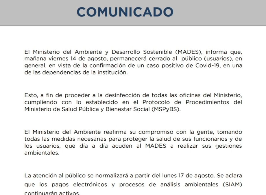 El Ministerio del Ambiente y Desarrollo Sostenible (MADES), informa que, mañana viernes 14 de agosto, permanecerá cerrado al público (usuarios), en general, en vista de la confirmación de un caso positivo de Covid-19, en una de las dependencias de la institución.