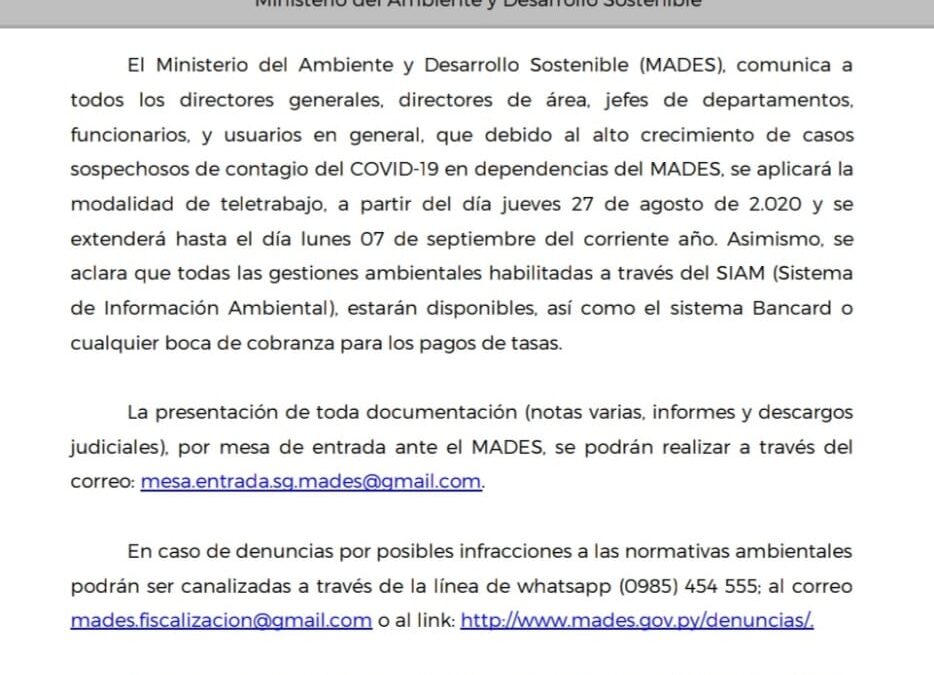El Ministerio del Ambiente y Desarrollo Sostenible (MADES), comunica a todos los directores generales, directores de área, jefes de departamentos, funcionarios, y usuarios en general, que debido al alto crecimiento de casos sospechosos de contagio del COVID-19 en dependencias del MADES, se aplicará la modalidad de teletrabajo, a partir del día jueves 27 de agosto de 2.020 y se extenderá hasta el día lunes 07 de septiembre del corriente año. Asimismo, se aclara que todas las gestiones ambientales habilitadas a través del SIAM (Sistema de Información Ambiental), estarán disponibles, así como el sistema Bancard o cualquier boca de cobranza para los pagos de tasas.