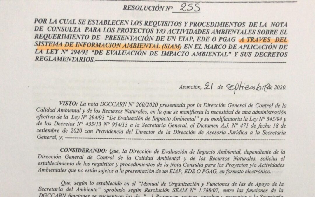 Mediante la Resolución N° 255/2020, el Ministerio del Ambiente y Desarrollo Sostenible (MADES), dispuso que, desde la fecha, la única vía para la tramitación de solicitudes de Nota Consulta, sea el Sistema de Información Ambiental (SIAM), mediante el “Módulo Nota Consulta”.