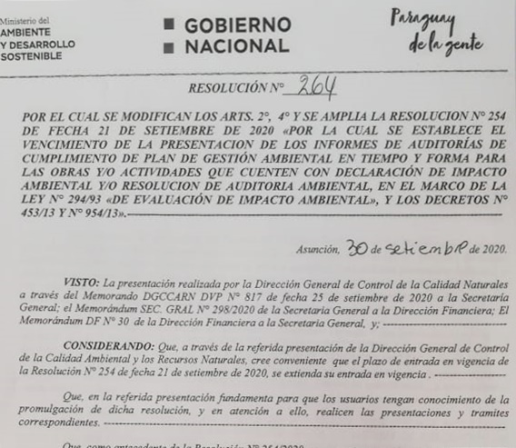El Ministerio del Ambiente y Desarrollo Sostenible (MADES), a través de la Resolución N° 264/2020, que modifica los artículos 2° y 4°, y amplía la Resolución N° 254 de fecha 21 de setiembre de 2020, amplió el plazo para que aquellos que no presentaron sus Informes de Auditorías de Cumplimiento de Plan de Gestión Ambiental en tiempo y forma puedan regularizar su situación.