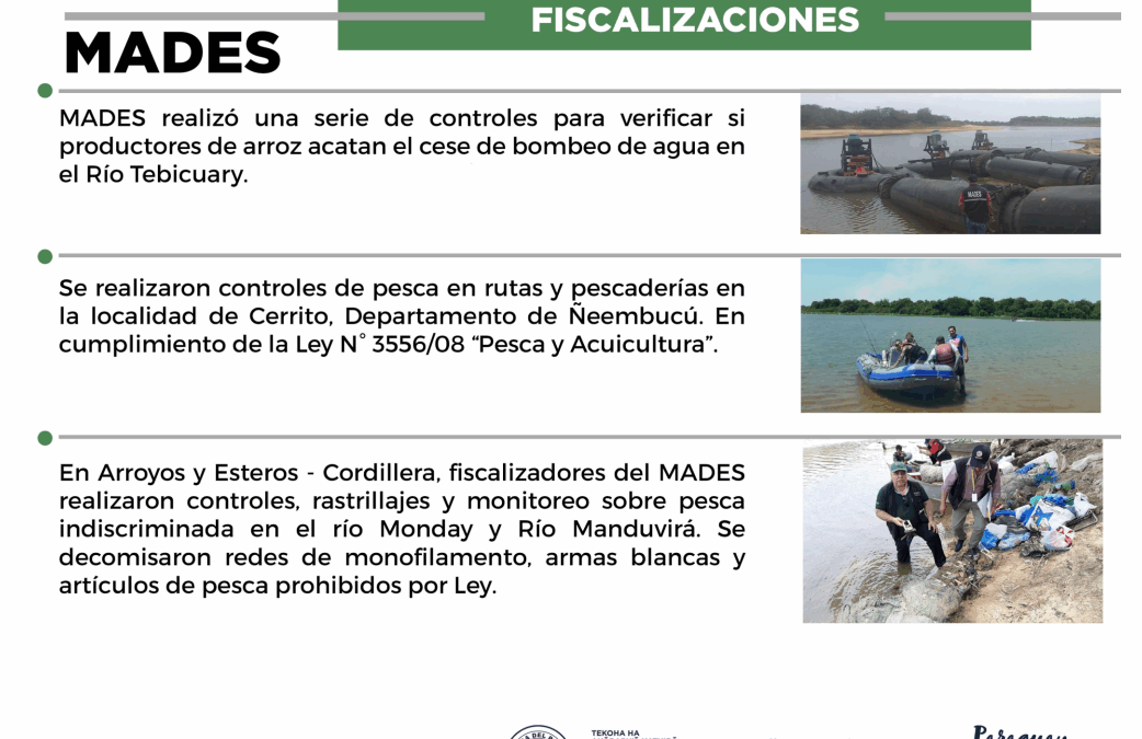 En tanto, en Arroyos y Esteros, Cordillera, fiscalizadores del MADES realizaron controles, rastrillajes y monitoreo sobre pesca indiscriminada en el río Monday y Río Manduvirá. En la ocasión, se decomisaron redes de monofilamento, armas blancas y artículos de pesca prohibidos por Ley.