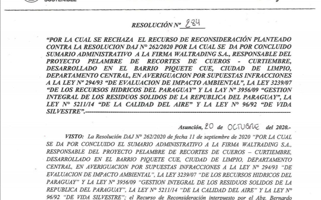 Por Resolución N° 284, el Ministerio del Ambiente rechazó el recurso de reconsideración planteado por la Firma Waltrading S.A., contra el sumario concluido en su contra donde se resolvió multar a la firma mencionada, con 20.000 jornales mínimos, por ser la responsable de la grave contaminación de la Laguna Cerro, ubicada en Piquete Cué, Limpio. La autoridad ambiental había calificado el hecho como “Infracción gravísima”.