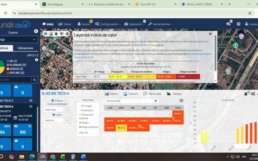 El sensor de calor instalado en Ñu Guazú registró durante el día niveles de temperatura extremadamente altos, con un índice máximo de 46.9 °C, ubicando el riesgo en la categoría de peligro según la escala de calor utilizada.