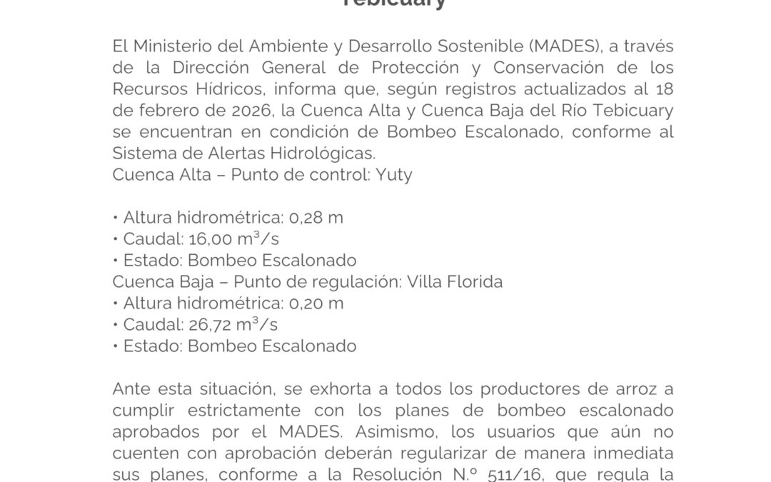 La Ministerio del Ambiente y Desarrollo Sostenible (MADES), a través de la Dirección General de Protección y Conservación de los Recursos Hídricos, informa que, según registros actualizados al 18 de febrero de 2026, la Cuenca Alta y Cuenca Baja del Río Tebicuary se encuentran en condición de Bombeo Escalonado, conforme al Sistema de Alertas Hidrológicas.