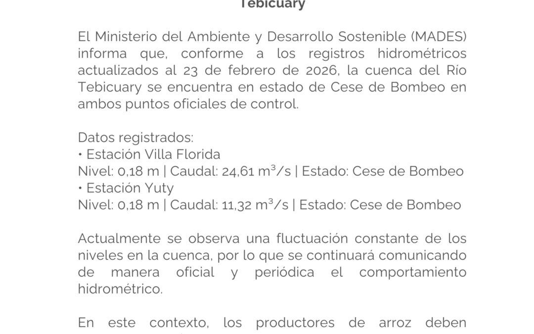 El Ministerio del Ambiente y Desarrollo Sostenible (MADES) informa que, conforme a los registros hidrométricos actualizados al 23 de febrero de 2026, la cuenca del Río Tebicuary se encuentra en estado de Cese de Bombeo en ambos puntos oficiales de control.