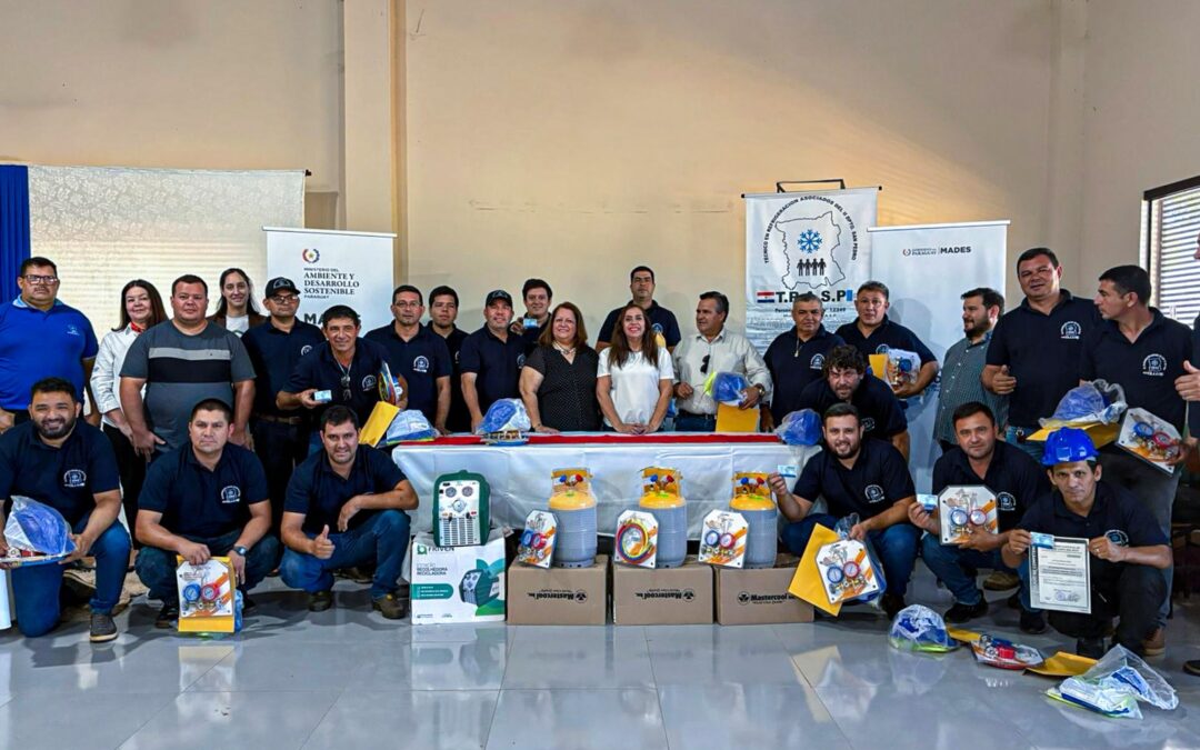Durante la jornada se entregaron certificados, carnets y equipos de protección personal a los técnicos que aprobaron el proceso de certificación en competencia laboral, evaluado por el INTN. Asimismo, se dotó de equipos y herramientas al Centro de Recuperación y Reciclaje de Refrigerantes de la Asociación de Técnicos en Refrigeración y Electrodomésticos de San Pedro (TRASP), en el marco de un convenio de cooperación con el MADES, con el objetivo de fortalecer las capacidades técnicas locales y promover el manejo seguro de sustancias del sector.