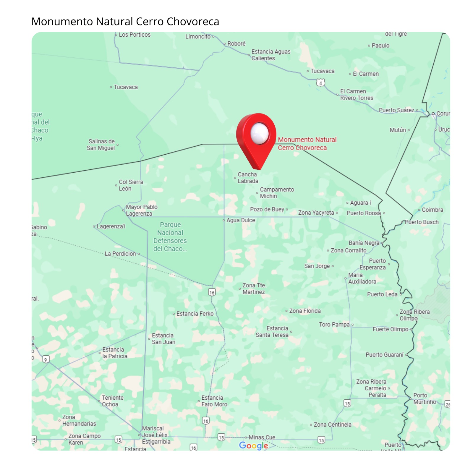 Estado del camino:Se accede desde Bahía Negra, principalmente en camionetas debido a la geografía del Chaco.